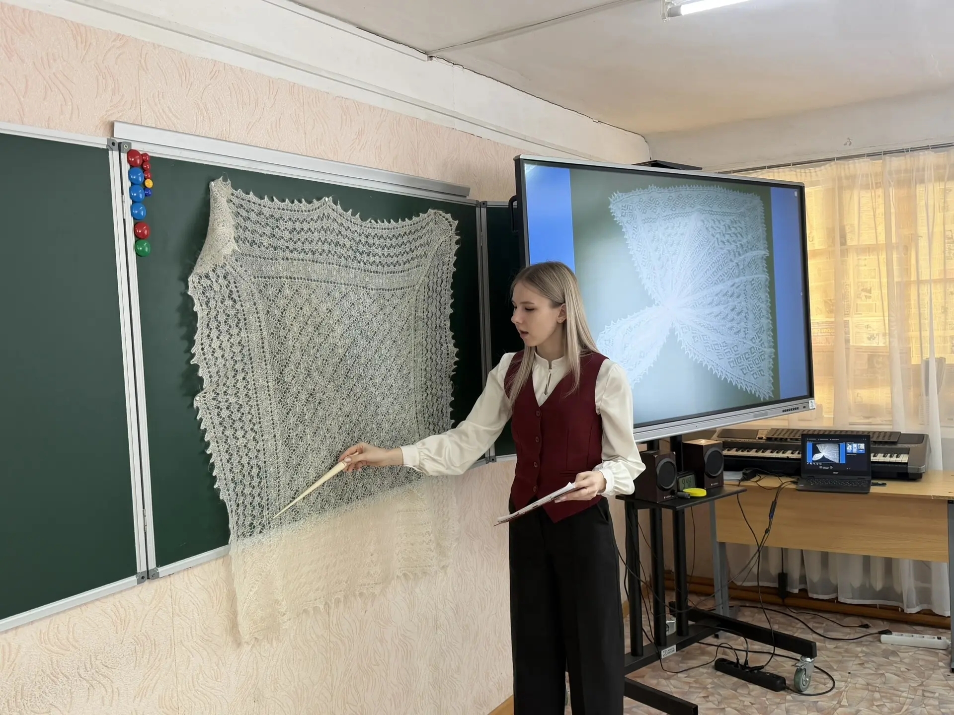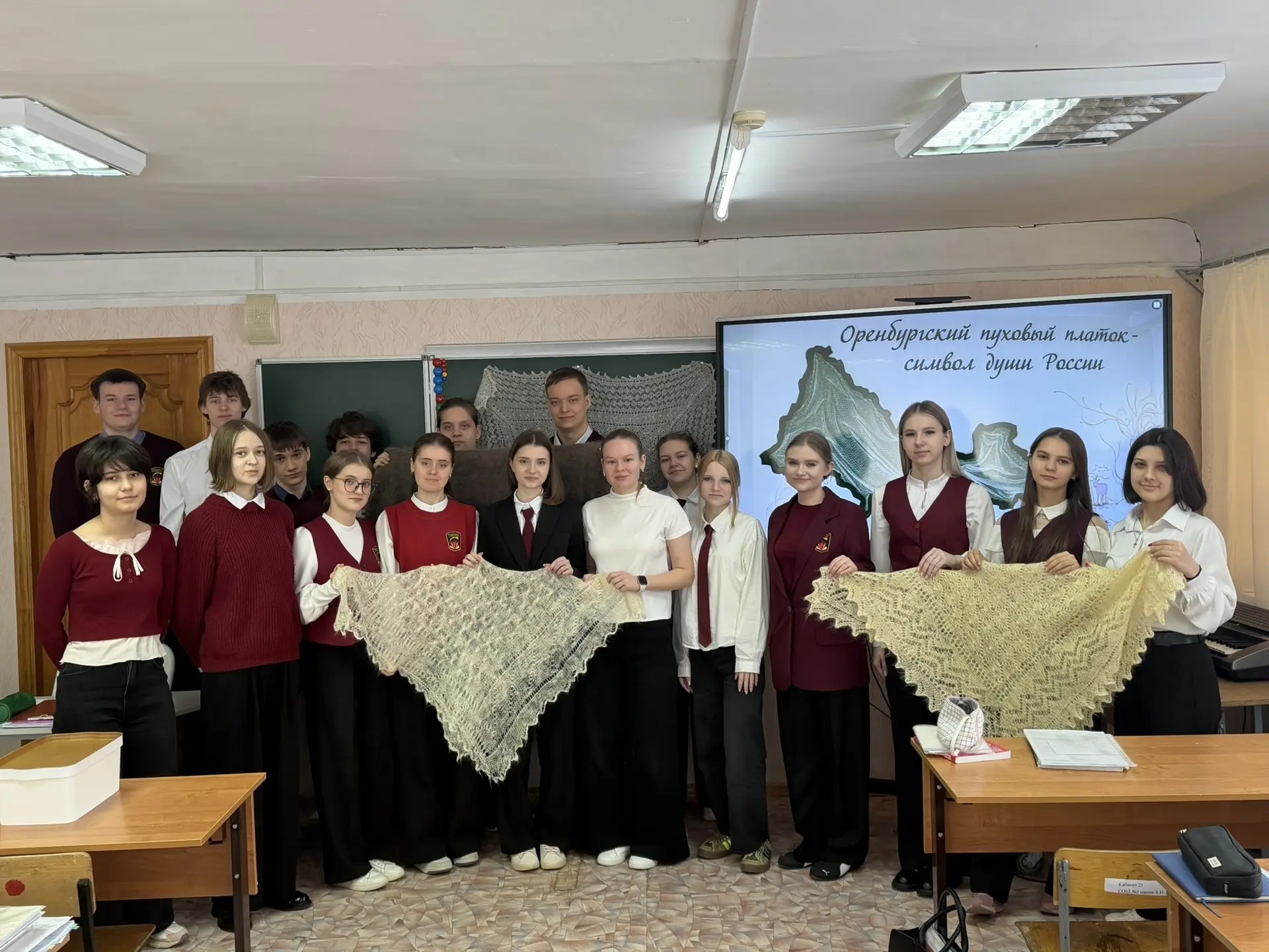 ?Ученица 10 класса Белкина Кристина на своем опыте осознала, каково работать экскурсоводом. Кристина провела большую работу по изучению главного символа нашей области - оренбургского пухового платка, провела серию занятий, где поделилась секретами этого уникального изделия.
