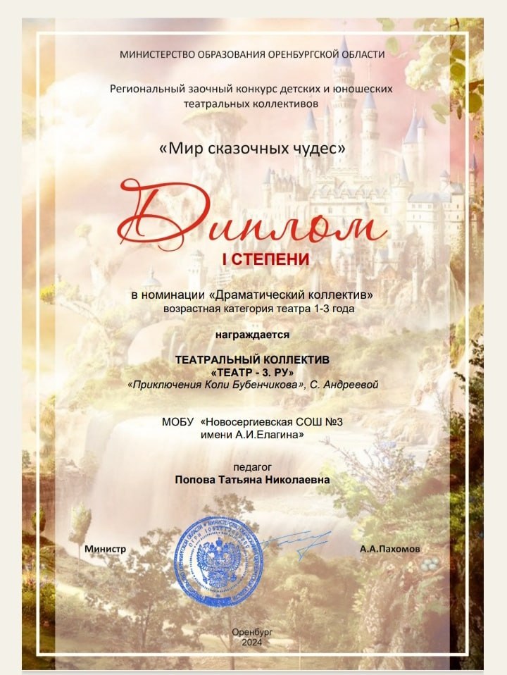 Диплом III степени фестиваля "Театрального Приволжья" регионального этапа за спектакль "Приключения Коли Бубенчикова".