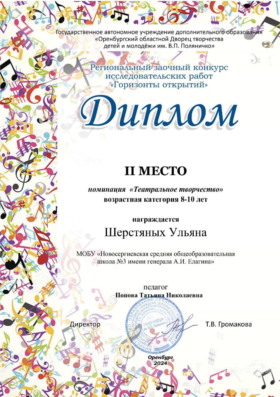 Региональный заочный конкурс исследовательских работ «Горизонты открытий» в номинации «Театральное творчество» - диплом, 2 место